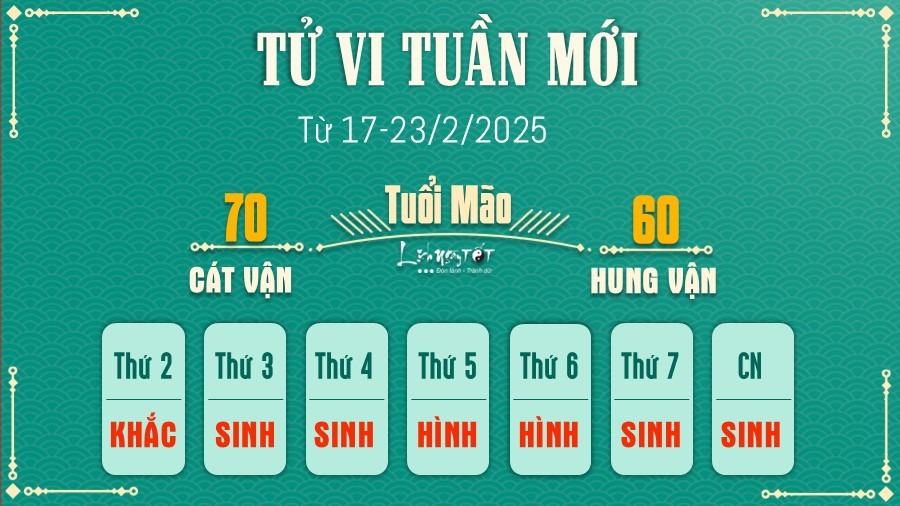 Tử vi tuần mới của 12 con giáp từ 17-23/2/2025 dự báo có Thái Tuế cản đường không tốt cho công việc của Dần trong tuần này. Hãy cẩn thận với những người cản trở công việc của bạn, những kẻ nói dối, lừa đảo, gián điệp,...