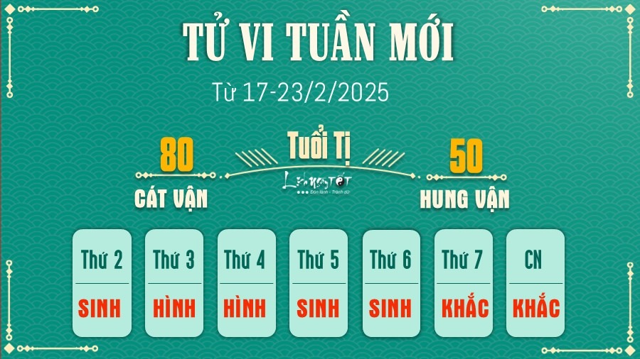 Thiên Đức dự báo tuổi Tị sẽ có một tuần tương đối bận rộn, làm việc không biết mệt mỏi. Bạn không có mấy thời gian nghỉ ngơi hay chăm sóc cho bản thân nhưng bù lại kết quả tốt vượt ngoài mong đợi.