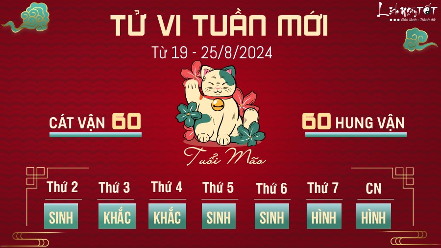 Tuần này đòi hỏi tuổi Mão phải kiên nhẫn, nó sẽ giúp bạn về đích với phong cách và lòng tự hào. Nếu bạn tập trung vào nhiệm vụ của mình, những hoạt động thường ngày tầm thường sẽ không làm bạn nản lòng. Hãy hướng mắt đến mục tiêu và tiếp tục tiến lên.