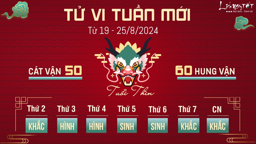 Có những chuyện buồn diễn ra khiến tuổi Thìn phải nhìn nhận lại cuộc sống. Bạn cũng được khuyến khích tìm kiếm sự thanh lọc, cho dù thông qua việc làm việc với một nhà trị liệu, viết nhật ký riêng tư, viết thơ hay bất cứ điều gì khác.
