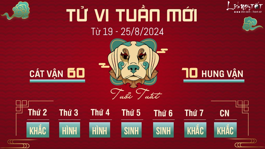 Người tuổi Tuất tuần này khá nhạy cảm và bạn dễ nóng giận với những sai sót nhỏ của một nửa của mình. Lời khuyên là bạn nên nhận ra sự khác biệt trong văn hóa gia đình và tư duy của hai người, ai cũng có lý do riêng cho hành động, lời nói của mình.