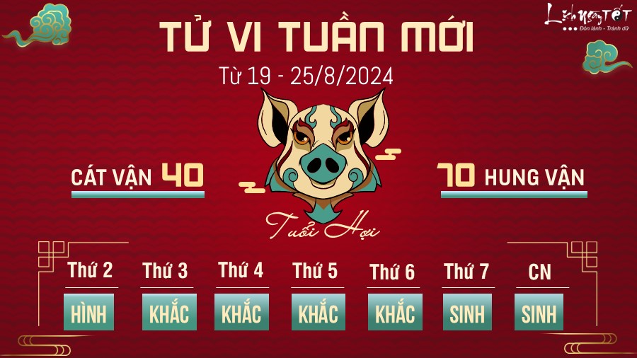 Tuần này, tuổi Hợi rất dễ bị kẻ xấu tấn công bằng lời nói hoặc hành động. Bạn cũng được khuyến khích tự kiềm chế bản thân nhiều hơn để luôn lưu tâm đến hành động và môi trường của mình. Hãy đặt ra những ranh giới lành mạnh nữa nhé!