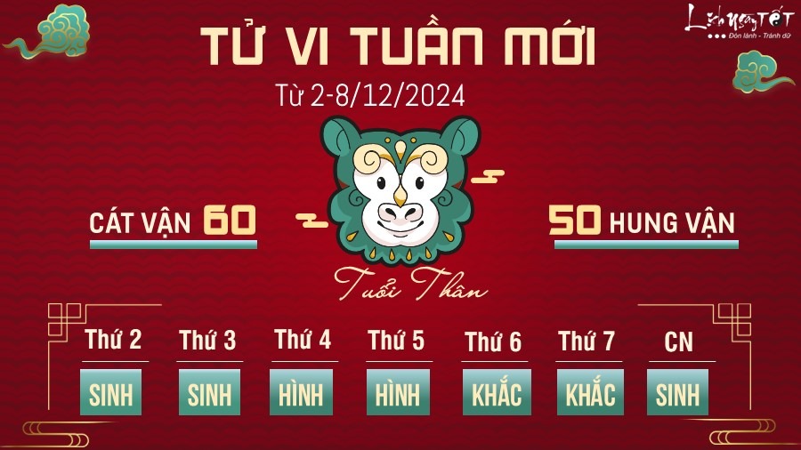 Tỷ Kiên xuất hiện đầu tuần khiến tuổi Thân rất dễ mất kiểm soát nhưng mọi thứ càng về cuối tuần càng "dễ thở" hơn bao giờ hết. Nên nếu bạn có thể nhẫn nhịn một chút thì mọi căng thẳng cũng không đáng để bạn bận tâm.
