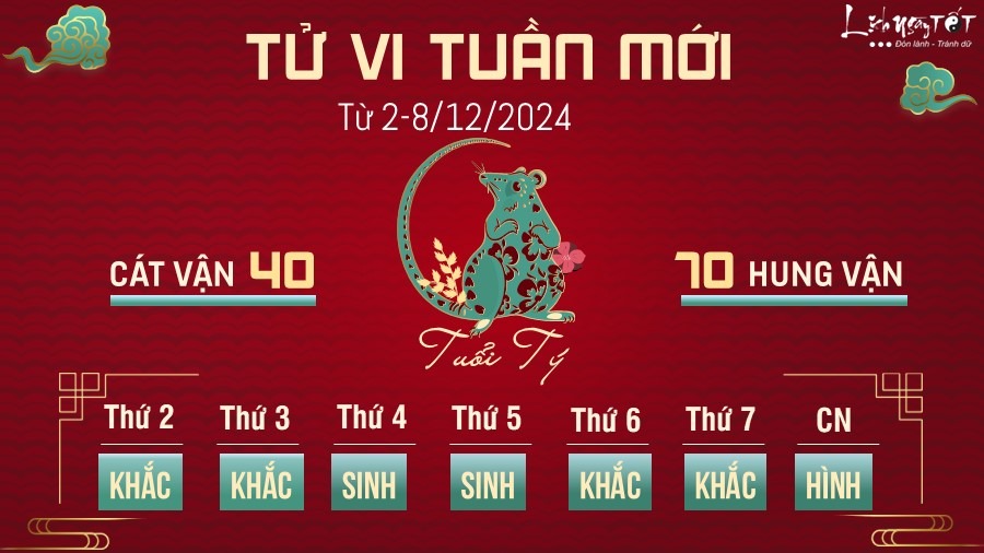 Tuần này tuổi Tý đừng quá kỳ vọng vào chuyện tình cảm, ngay cả mối quan hệ mới chớm nở cũng cần thời gian, do đó, bản mệnh không nên vội vàng. Càng về sau bạn càng có những phát hiện thú vị hơn về người mà bạn đang tìm hiểu.