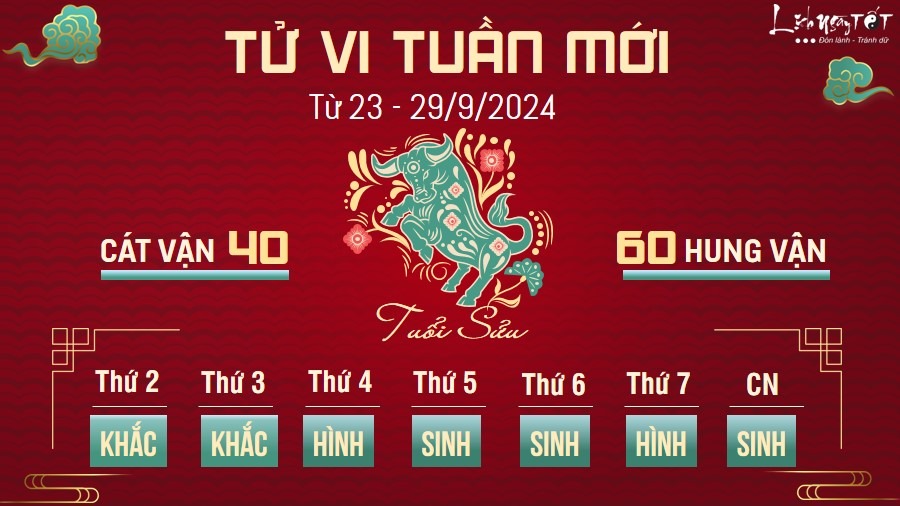 Đầu tuần, người tuổi Sửu nhận được nhiều sự ưu ái của lãnh đạo. Đối phương có thể giao cho bạn nhiều nhiệm vụ trọng đại, hãy mạnh dạn chấp nhận, đây là cơ hội để bạn khẳng định vị thế của mình trong tập thể.