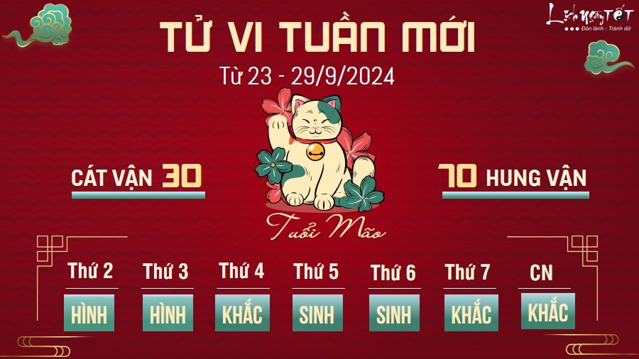 Có lẽ tuần này là khoảng thời gian chẳng lấy gì làm may mắn đối với người tuổi Mão. Bản mệnh nên biết mình biết ta hơn, hợp tác tốt với đồng nghiệp hơn thì công việc mới có tiến triển, không thể làm mọi việc theo ý muốn của mình.