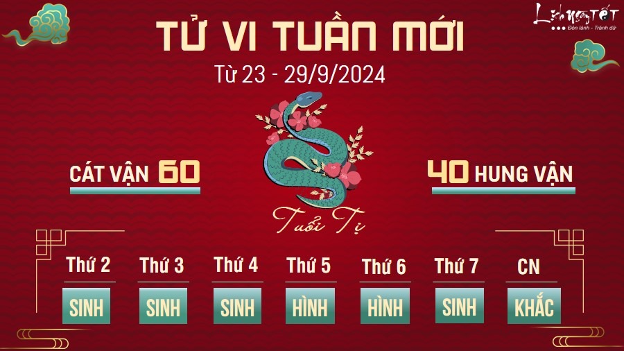 Tuần này, người tuổi Tị có cơ hội vượt qua khó khăn để khẳng định bản thân. Kẻ tiểu nhân có thể xuất hiện hòng tìm cách ngáng đường bạn, song bạn hoàn toàn có thể vượt qua nhờ vào kiến thức và kinh nghiệm của mình.