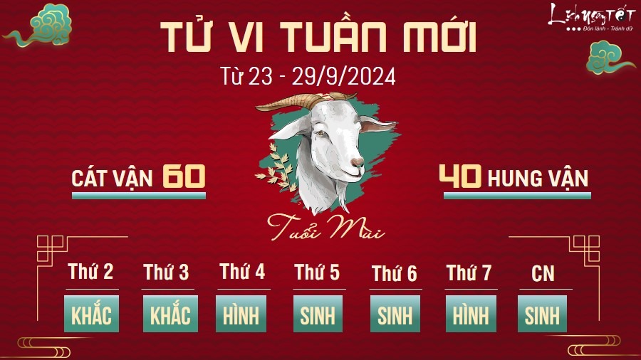 Người tuổi Mùi sẽ có một tuần làm việc hiệu quả. Con giáp này giữ được đầu óc sáng suốt và phát huy được sức sáng tạo của mình nên có thể đưa ra những ý kiến chính xác, giúp chỉ đường dẫn lối cho tập thể.