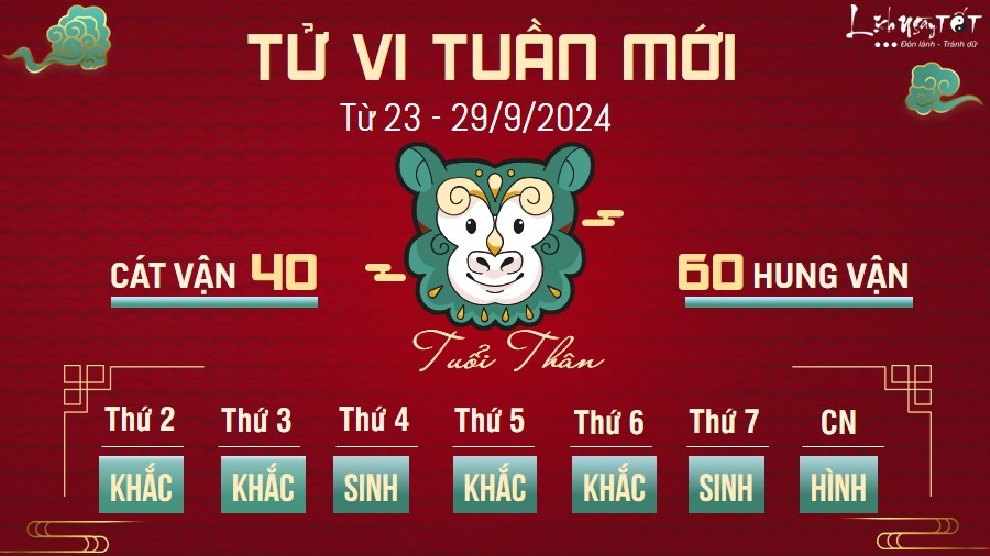 Tử vi tuần mới của 12 con giáp từ 23 - 29/9/2024 thấy rằng tuần này hung cát song hành với người tuổi Thìn. Bạn được cấp trên ưu ái nhưng lại dễ đắc tội với đồng nghiệp xung quanh, khiến công việc tiến triển lúc tốt lúc xấu.