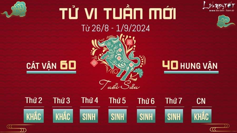 Tử vi tuần mới của 12 con giáp từ 26/8 - 1/9/2024 cho biết, cát tinh Tử Vi che chở cho người tuổi Sửu nên vận trình trên đà khởi sắc rõ ràng. Bạn có thể tận dụng cát khí trong khoảng thời gian này để triển khai kế hoạch mới hoặc lập kế hoạch sẵn sàng cho bước đường thăng tiến sắp tới của mình.