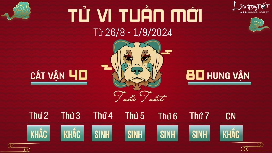 Vận trình của người tuổi Tuất giảm sút đáng kể trong tuần bị Thiên Cẩu ám hại, kéo theo công việc gặp trục trặc, phát sinh nhiều vấn đề phức tạp, mất nhiều thời gian để xử lý. Dấu hiệu cạnh tranh trong công việc ngày càng rõ ràng, bạn đặc biệt lưu tâm.