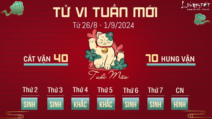 Người tuổi Mão tuần này gặp hung vận lớn. Bản mệnh sẽ gặp phải chuyện không may mắn do tác động của hung tinh. Con giáp này vừa có nguy cơ bị chơi xấu cộng thêm vì lơ là, thiếu tập trung vào công việc nên càng tạo cơ hội cho kẻ xấu dựng chuyện.