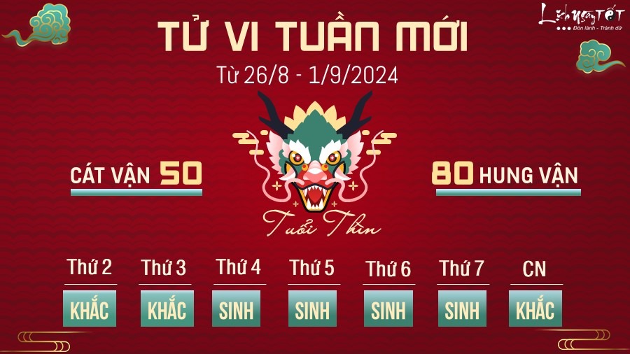 Thiên Quan xuất hiện ngay từ đầu tuần cảnh báo người tuổi Thìn về những sự cố, trở ngại mà bạn sẽ phải đối mặt trong tuần này. Thời gian tới áp lực gia tăng, cạnh tranh thêm gay gắt, bạn nên có sự chủ động và chuẩn bị tâm lý tốt để có thể đương đầu với mọi tình huống bất lợi.