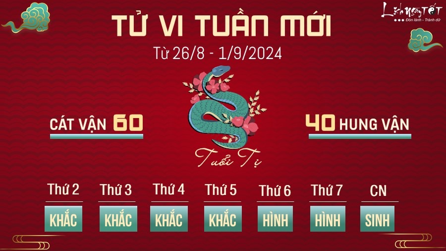 Sao Thái Âm xuất hiện có lợi cho tình duyên của người tuổi Tị. Người độc thân vận đào hoa vượng, dễ dàng thu hút sự chú ý của người khác giới. Đặc biệt, nữ mệnh tuần này sẽ được ưu ái hơn nam mệnh, hãy tận dụng thật tốt cơ hội này, mở rộng mối quan hệ bạn bè, biết đâu bạn sẽ gặp được người ấy.