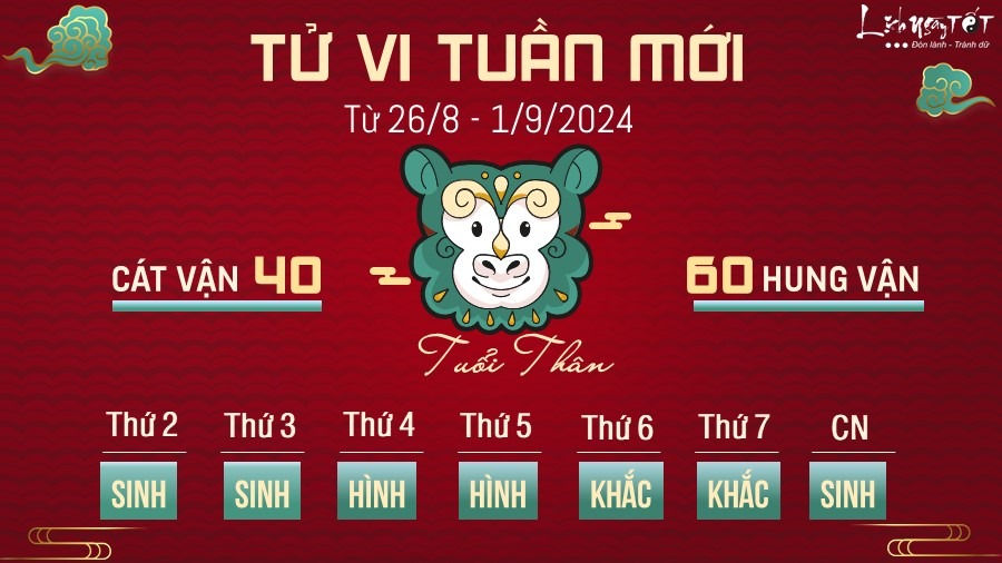 Hung tinh Thái Tuế tác động không nhỏ đến vận trình tuần này của người tuổi Thân. Hầu hết các kế hoạch của bạn đều có thể bị cản trở nửa chừng, làm nhiều mà chưa chắc đã được hưởng thành quả xứng đáng.