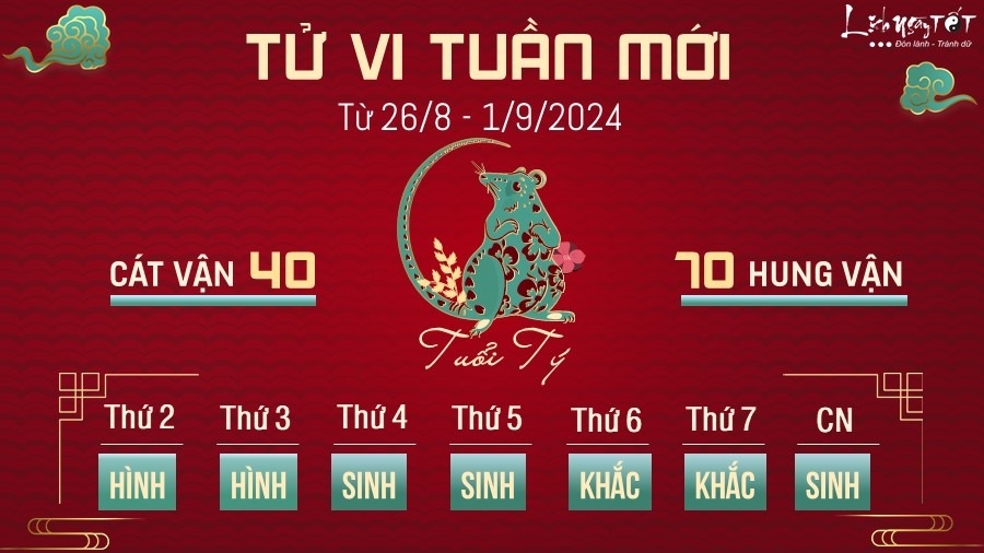 Tài vận trong tuần của những chú Chuột cũng bị xui xẻo đeo bám. Dù trong tuần vẫn có những cơ hội kiếm tiền nhưng hung tinh đe dọa sẽ khiến tiền bạc trong tay tuổi này có thể biến mất lúc nào không hay. Bản mệnh cũng chớ nên tiêu xài hoang phí kiến túi tiền càng thêm hao hụt.
