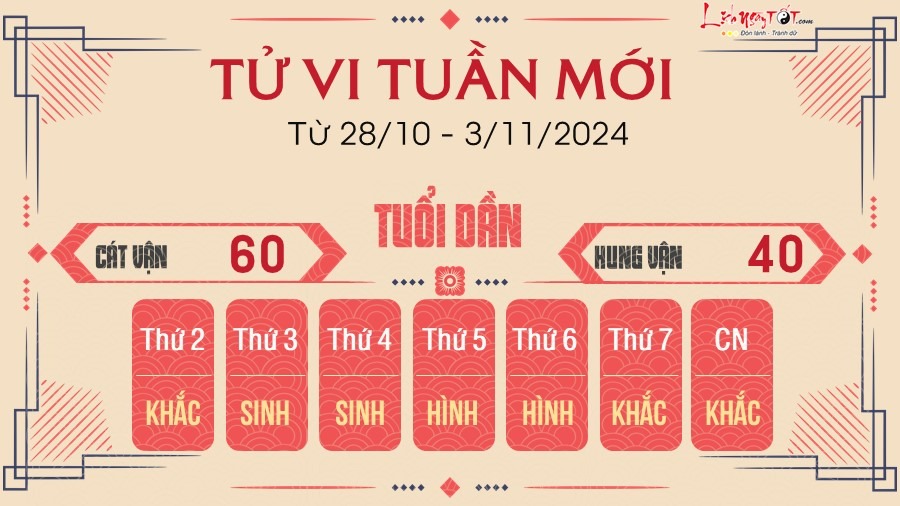 Đây có thể coi là một tuần nhẹ nhàng với người tuổi Dần nhờ sao Tử Vi hỗ trợ, bạn có thể yên tâm làm việc của mình mà không gặp phải quá nhiều trắc trở. Một số người còn trở thành tâm điểm của sự chú ý, ký kết được những hợp đồng có giá trị, đem lại lợi nhuận cao và khẳng định giá trị của bản thân.