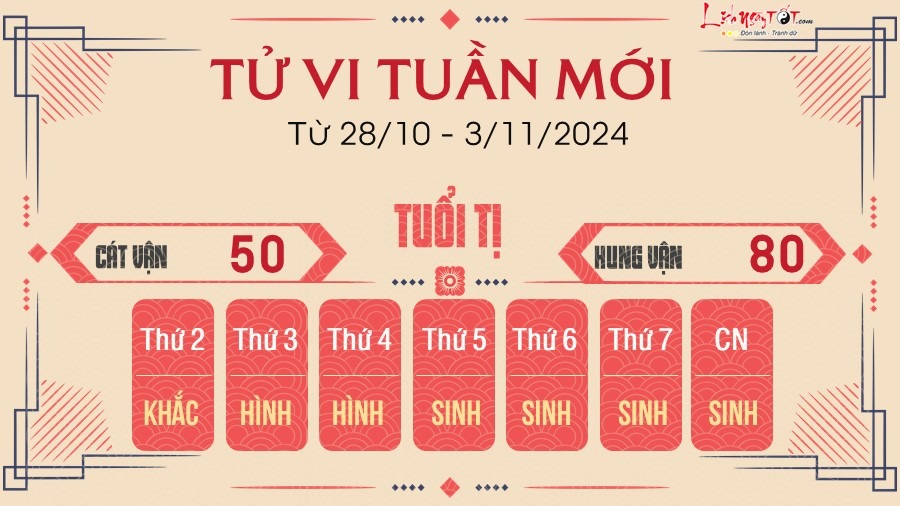Các mối quan hệ tại nơi làm việc của Tị có thể xuất hiện tranh cãi, va chạm, xung đột trong tuần này do hung tinh Ngũ Quỷ tác động. Bạn thẳng thắn là tốt nhưng nếu không biết tiết chế lại thì nó sẽ phản tác dụng, vì nói lên suy nghĩ của mình mà có thể khiến người khác mất lòng.