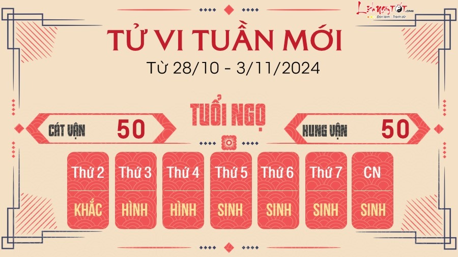 Tuần này Ngọ khó có được bước thăng tiến đúng như mình mong đợi. Bạn không tập trung làm việc nên dễ mắc phải sai lầm, khiến cho tiến độ công việc bị trì trệ. Điều này có thể khiến bạn bị cấp trên quở trách, bị khách hàng thúc giục, áp lực căng thẳng vô cùng.
