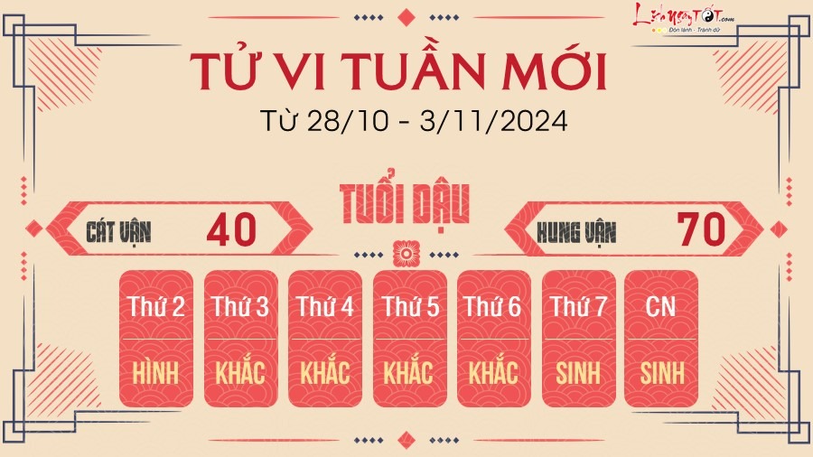 Tuần mới báo hiệu chuyện tình cảm của tuổi Dậu gặp phải nhiều xáo trộn. Bạn thường thể hiện cảm xúc một cách bốc đồng, đôi khi còn khá cực đoan, trong khi đó nửa kia lại luôn nhìn vào thái độ của bạn để suy đoán, chính điều này đã trở thành nguyên nhân gây tranh cãi lớn giữa hai người.
