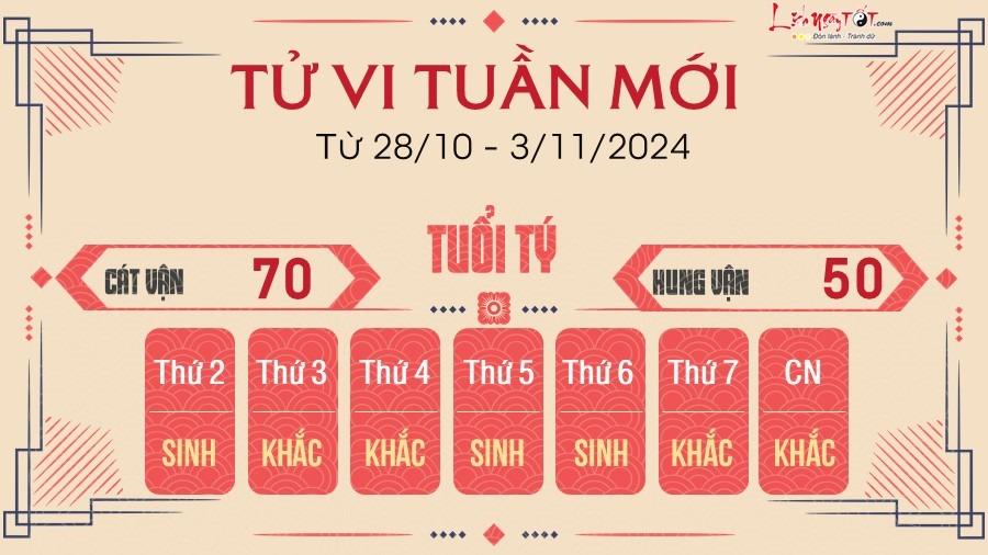 Người tuổi Tý có sự che chở từ Thiên Đức cát tinh nên vận trình tuần mới có nhiều khởi sắc. Xuyên suốt cả tuần, bản mệnh gặp được nhiều cơ may trong những lĩnh vực mới mẻ, hứa hẹn sẽ có nhiều điều vô cùng hấp dẫn.