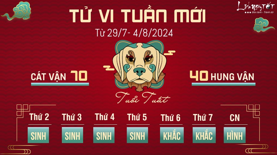 Sự nghiệp của con giáp tuổi Tuất là trọng tâm chính trong tuần này. Nếu bạn ưu tiên việc này, bạn sẽ đạt được nhiều thành tựu hơn bao giờ hết và cũng có thể vượt qua một số cột mốc quan trọng trên đường đi.