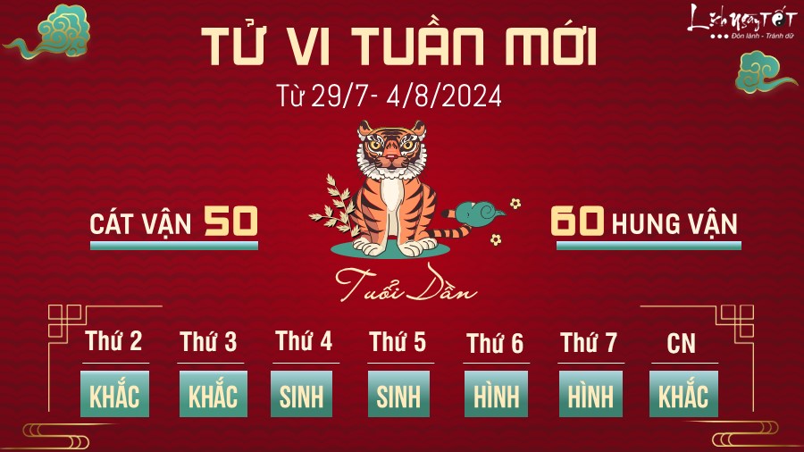 Chuyện tình cảm của tuổi Dần lúc này không được thuận lợi. Do đó, bạn hãy tin vào lời khuyên của chính bạn trong tuần này hơn ai hết. Nửa đầu tuần sẽ kiểm tra sự kiên nhẫn của bạn trong vấn đề này, nếu bạn biết nhún nhường, cho qua thì căng thẳng mới trôi qua nhanh được.