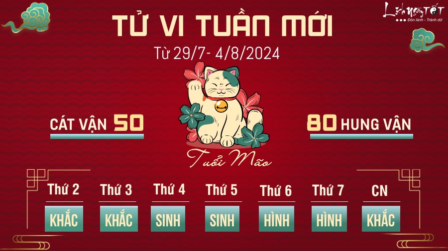 Tử vi tuần mới của 12 con giáp từ 29/7- 4/8, tuổi Mão không vừa ý với những gì đang diễn ra trong đời sống tình cảm. Bản mệnh nên cân nhắc kỹ trước khi đưa ra quyết định về tình cảm và không nên vội vàng chọn người để tránh những tổn thương không đáng có cho cả hai bên.