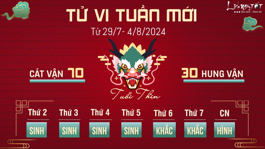 Tuổi Thìn khá tự tin trong tuần mới, điều đó có thể tập trung nhiều hơn vào những thành công và thành tựu mà bạn có thể đạt được trong vài ngày tới. Điều đó có thể giúp bạn có được nguồn năng lượng êm dịu và cho phép bạn đối mặt với quá khứ của mình bằng lăng kính và trí tuệ mới.