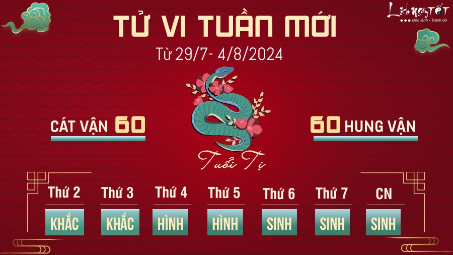 Tuổi Tị khó tránh khỏi những chuyến đi cần thiết xuất hiện trong tuần. Tuy nhiên hãy vui vẻ đón nhận với quan niệm rằng càng vất vả, bôn ba, xông xáo thì càng có cơ hội để bạn thu hoạch càng lớn.