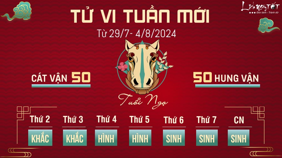 Càng cuối tuần thì tình hình của tuổi Ngọ càng được cải thiện với sự nâng đỡ của Chính Quan vì thế nếu có đối mặt với bất cứ thăng trầm nào trong tuần thì cứ bình tĩnh, đôi khi cứ để mặc mọi thứ tự xuất hiện và biến mất, bạn không phải làm gì cả.