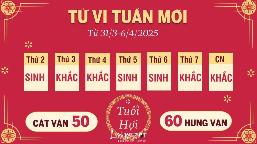 Cuối tuần này có Tam Hợp tìm tới khá tốt cho công việc của Hợi. Con giáp này nên chọn ngày thứ 5 để đưa ra quyết định lớn cho công việc. Những người làm ăn nhỏ lẻ hoặc đang ở nước ngoài nên hạn chế xích mích với đồng nghiệp, khách hàng kẻo bản thân lại chịu nhiều thiệt thòi.