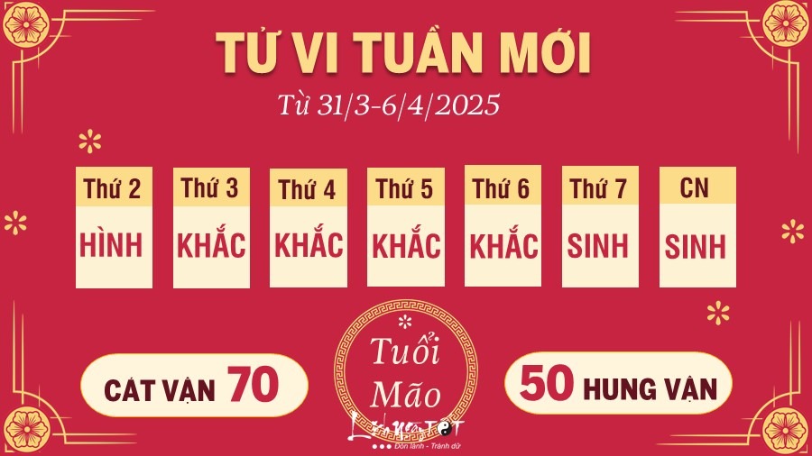 Thái Dương chiếu mệnh, tuần này công việc của bạn đang tiến triển rất tốt, Mão được những người có địa vị cao ủng hộ. Những bạn trẻ tuổi này dễ mà gặt hái được nhiều thành quả to lớn và dự kiến sẽ nhận được sự công nhận và giải thưởng liên quan tới sự sáng tạo, đổi mới trong công việc.