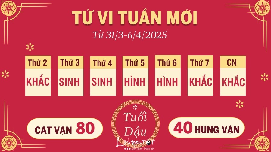 Tử Vi cát tinh chiếu cố, sự nghiệp của bạn đã bước vào giai đoạn quan trọng. Lúc này, Dậu nên nắm lấy thời cơ, bạn phải tràn đầy quyết tâm, kiên định, chủ động ứng phó với thử thách và thể hiện sức mạnh của mình trong công việc, đời sẽ sang trang mới. Tuần này cực tốt cho bạn nào làm kỹ thuật, nghệ thuật, xây dựng, môi trường, nông sản.