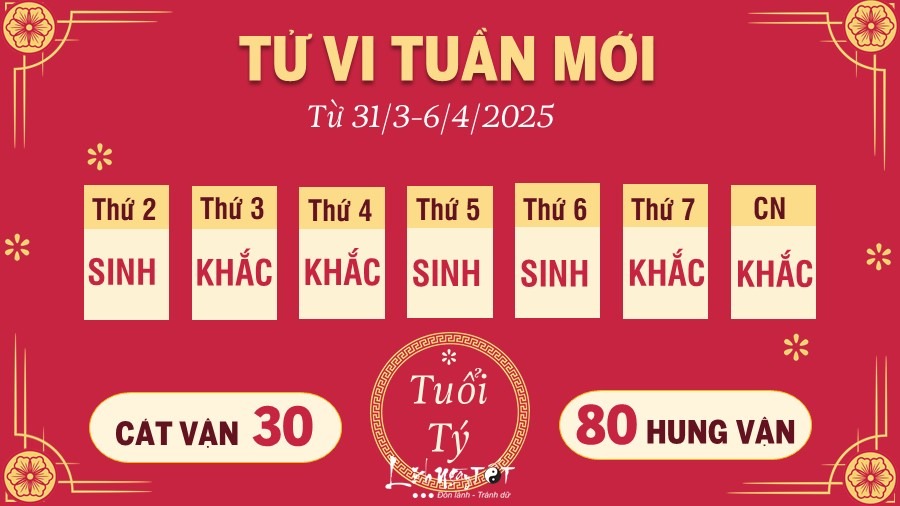 Cần lưu ý rằng tuần này cũng sẽ có áp lực cạnh tranh rõ ràng, vì vậy hãy cẩn thận với những kẻ xấu cố gắng đánh cắp uy tín hoặc công sức của bạn tại nơi làm việc. Tý cũng cần cẩn thận để tránh thua lỗ trong đầu tư, mất tiền do phải chi cho các mối quan hệ cá nhân hoặc hư hỏng đồ đạc.