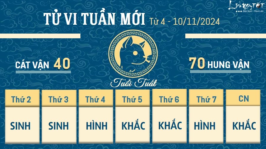 Người tuổi Tuất có thể không được thuận lợi như ý muốn trong tuần này. Bạn nóng nảy và mâu thuẫn với cấp trên. Đối phương có thể cố tình giao cho bạn thêm nhiều việc khó, khiến bạn cảm thấy vô cùng căng thẳng.