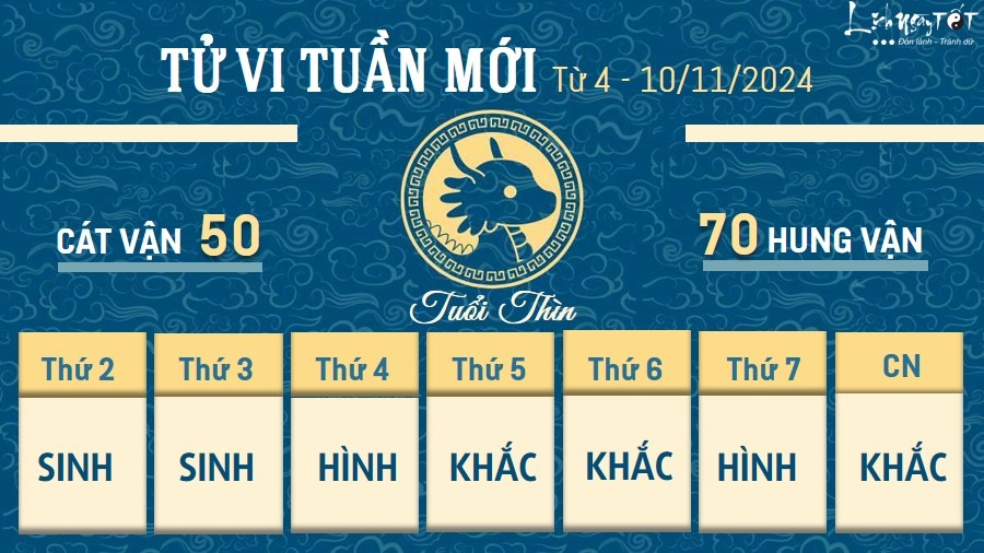 Có thể người tuổi Thìn sẽ phải đối diện với nhiều khúc mắc trên phương diện sự nghiệp trong tuần này. Bạn và đồng nghiệp thường xuyên mâu thuẫn, tranh cãi với nhau nên các công việc tập thể khó có thể hoàn thành thuận lợi.