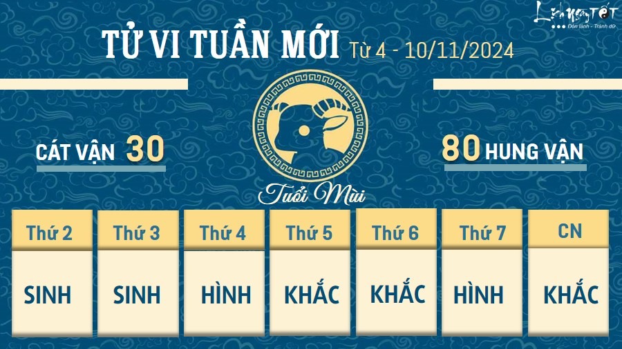 Người tuổi Mùi có thể sẽ phải trải qua một tuần khá khó khăn và nhiều thách thức, những việc bạn tưởng chừng quen thuộc cũng có thể xảy ra vấn đề do có tiểu nhân quấy phá. Bạn không được lơ là trong công việc kẻo dễ xảy ra sự cố đáng tiếc.