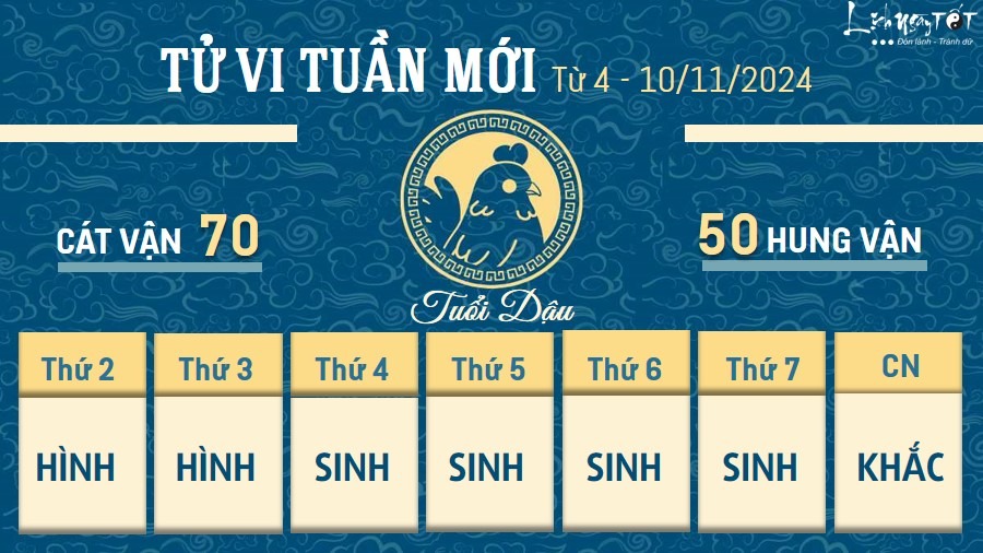 Tuần này là một tuần vô cùng thuận lợi đối với người tuổi Dậu. Bạn tin tưởng vào khả năng của bản thân và thể hiện quan điểm của mình đúng lúc đúng chỗ. Bạn thậm chí có thể trở thành người dẫn dắt tập thể vượt khó khăn.
