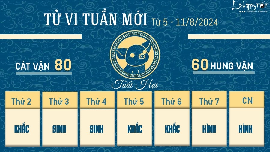 Tuần này Hợi sẽ gặp vận may tài chính tốt và bạn sẽ có một số cơ hội đầu tư suôn sẻ. Bạn có thể chọn phương thức đầu tư phù hợp với mình dựa trên tình hình thực tế và khả năng chịu rủi ro của bạn. Dù vậy bạn không nên mù quáng chạy theo xu hướng hoặc đầu tư quá bốc đồng.