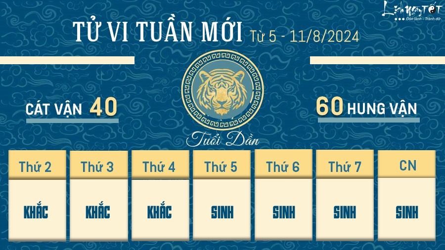 Xem tử vi hàng tuần, người tuổi Dần khó gặp may mắn về tiền bạc trong tuần bị ảnh hưởng bởi hung tinh Đại Hao. Các kế hoạch, dự định kiếm tiền của bạn khá ảm đạm, tiền vào thì ít mà ra thì nhanh, nguy cơ hao hụt luôn hiện hữu.