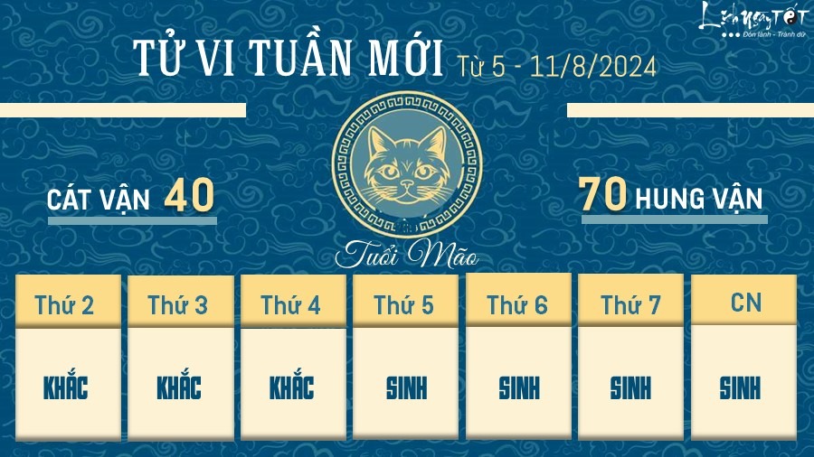 Vận trình công việc có thể xảy ra những điều bất trắc. Nếu không muốn xảy ra những rắc rối nghiêm trọng, tử vi tuần mới khuyên tuổi Mão nên tiết chế sự chủ quan và vội vàng của mình, lấy thận trọng làm đầu. Có đôi khi bạn còn khá nóng nảy, hay nổi giận vô cớ, dễ gây xích mích với đồng nghiệp.