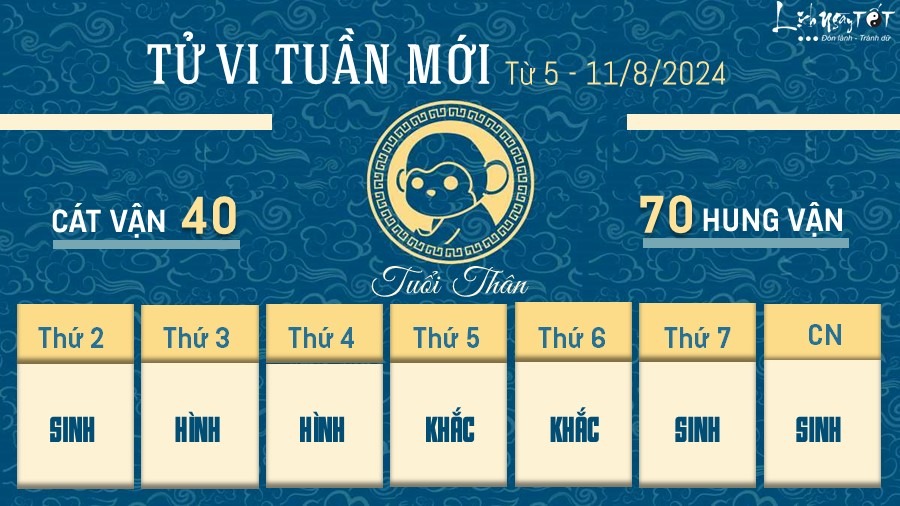 Thái Tuế tác động, vận trình tuần mới của người tuổi Thân có hung cát đan xen, bạn sẽ phải nỗ lực rất nhiều mới có thể đạt được điều mình muốn hoặc ít nhất là giữ cho mọi việc ở trạng thái ổn định. Con giáp này không đảm bảo được tiến độ nên gây ra nhiều ảnh hưởng tiêu cực và bị đánh giá không tốt.