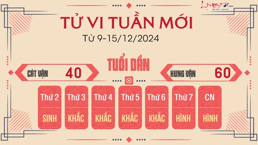 Sao Thiên Cẩu tác động, hung vận có xu hướng tăng cao trong tuần mới, người tuổi Dần cần hết sức chú ý. Bạn tốt nhất nên quản lý và duy trì những kết quả hiện có hơn là thực hiện một sự thay đổi nào đó quá lớn.