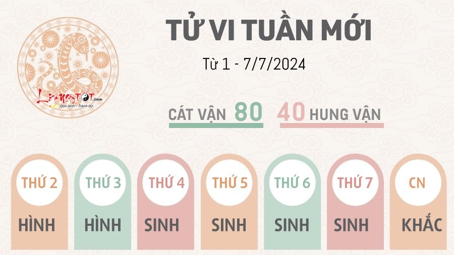 Một số bạn tuổi Tị có ý định chuyển việc hoặc nghỉ việc. Đây là quyết định nghe thì tương đối mạo hiểm nhưng thực ra lại rất hợp lý trong tuần này. Bên cạnh đó, nam mệnh tuổi Tị dễ gặp được quý nhân tương trợ bất ngờ. Nữ mệnh thì bản lĩnh có thừa, có gan làm ăn, cày cuốc hơn hẳn bạn bè xung quanh, làm gì cũng đỏ.