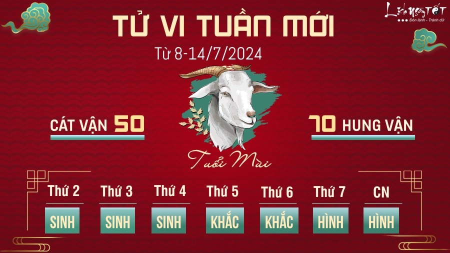 Thiên Quan gây trở ngại vào ngày đầu tiên tuần mới khiến tuổi Mùi hết sức lo lắng. Nhưng có thể vì thế mà bạn khiếm tốn, thận trọng và có thể tìm thấy cơ hội kiếm được tiền bạc ngay sau đó.