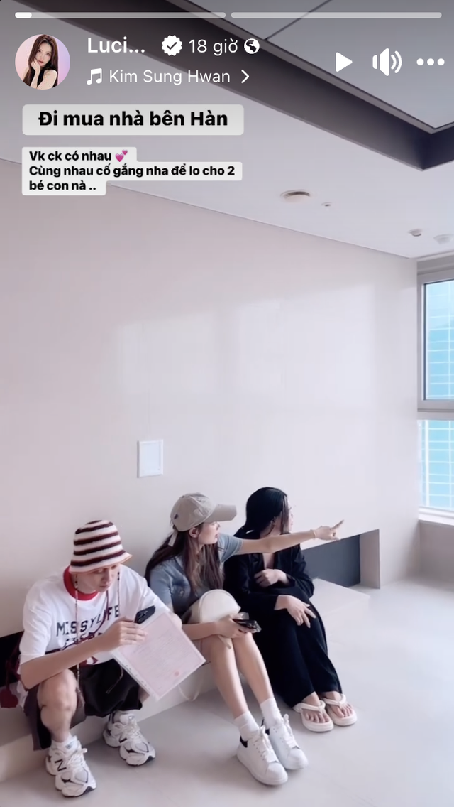 Về phần mình Lucie Nguyễn đăng ảnh đi mua nhà ở Hàn Quốc và viết: “Vợ chồng có nhau. Cùng nhau cố gắng để lo cho 2 bé con nha”.