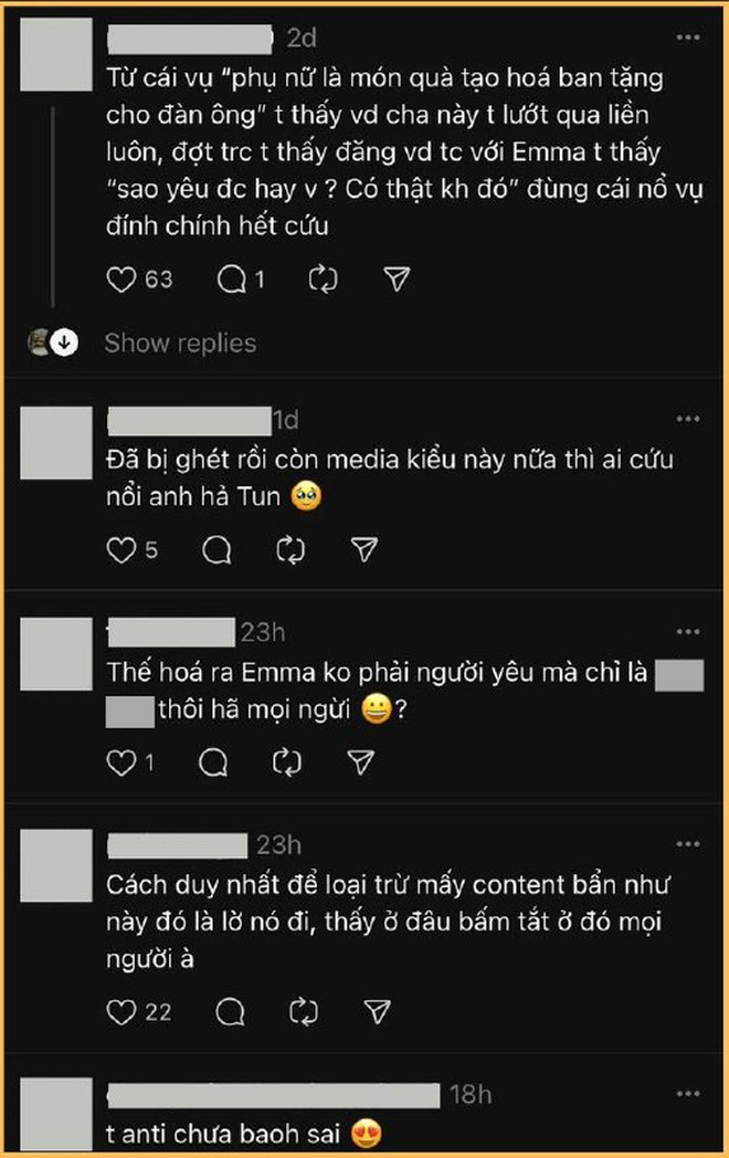 "Thấy ở đâu là bấm tắt ở đó", "Anti chưa bao giờ sai", "Đợt trước thấy đăng video tình cảm với Emma tui đã nghĩ sao yêu được vậy? Có thật không đó, đùng cái nổ ra vụ đính chính... hết cứu"... là những comment dân mạng bày tỏ sự ngao ngán trước pha quay gấp, cua xe khét lẹt của Tun Phạm trong chuyện tình cảm, sau những ồn ào làm mất hình ảnh cách đây cũng chưa lâu.