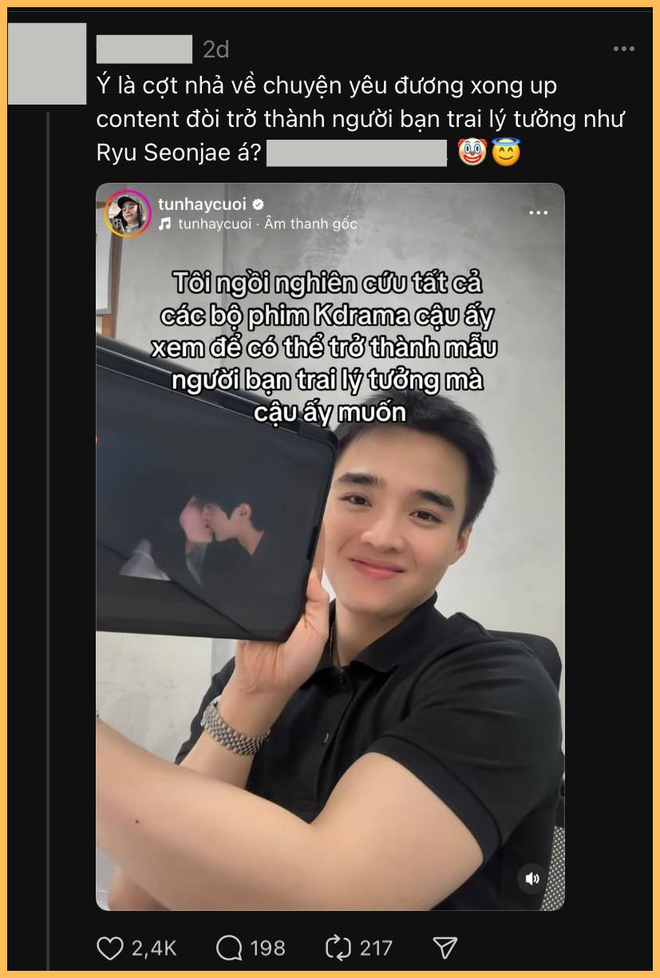 Hiện tại, sau khi gọi Emma Nhất Khanh là "người đồng hành sáng giá" Tun Phạm lại tiếp tục làm content về yêu đương, dù không gọi tên đối tượng nhưng ai cũng biết người mà cậu nhắm đến là ai. Cụ thể, trong một post trên Threads mới đây, Tun mượn content của phim Hàn để tiếp tục tung "hint" hẹn hò: "Nghiên cứu các bộ phim Hàn mà cậu ấy xem, để trở thành mẫu bạn trai lý tưởng mà cậu ấy muốn". Cách đấy chỉ vài ngày, Emma Nhất Khanh cho biết cũng đang cuồng bộ phim này.