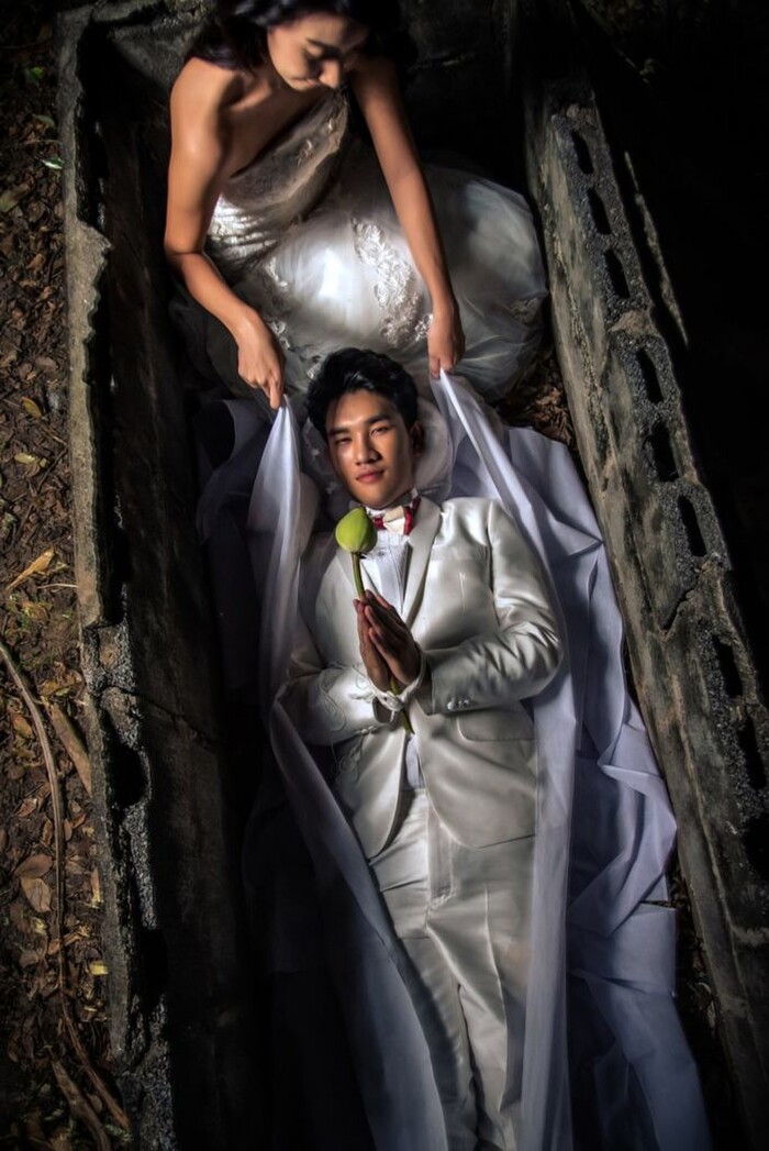 Đây không phải là đôi vợ chồng son đầu tiên chụp ảnh theo phong cách “rùng rợn” này. Năm 2015, cặp đôi người Singapore Jenny Tay và Darren Cheng cũng khiến cộng đồng mạng xôn xao khi tung bộ ảnh hai người cùng nằm trong quan tài.